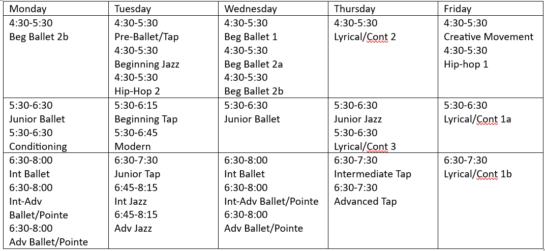 *As the Tuesday Preballet/Pretap class is full, we have added Pre-ballet/Pre-Tap (~age 3.5-5) Th 4:30-5:30 which will begin Oct 2